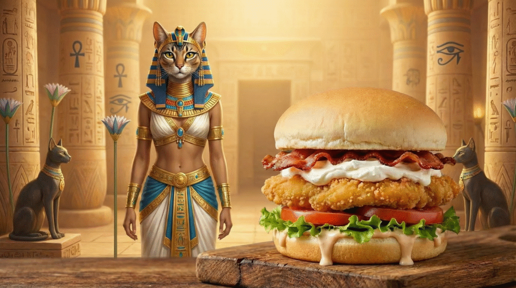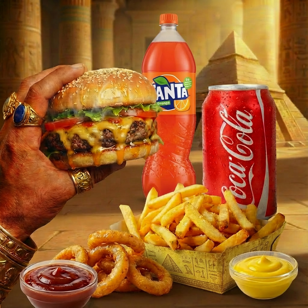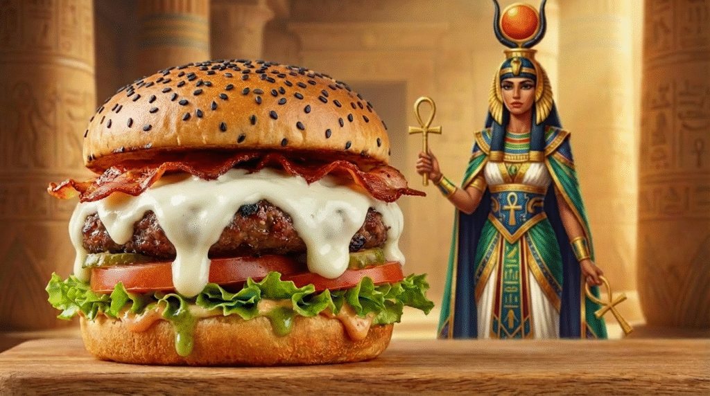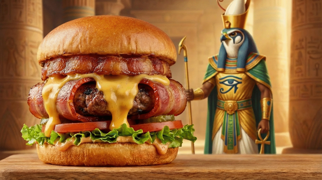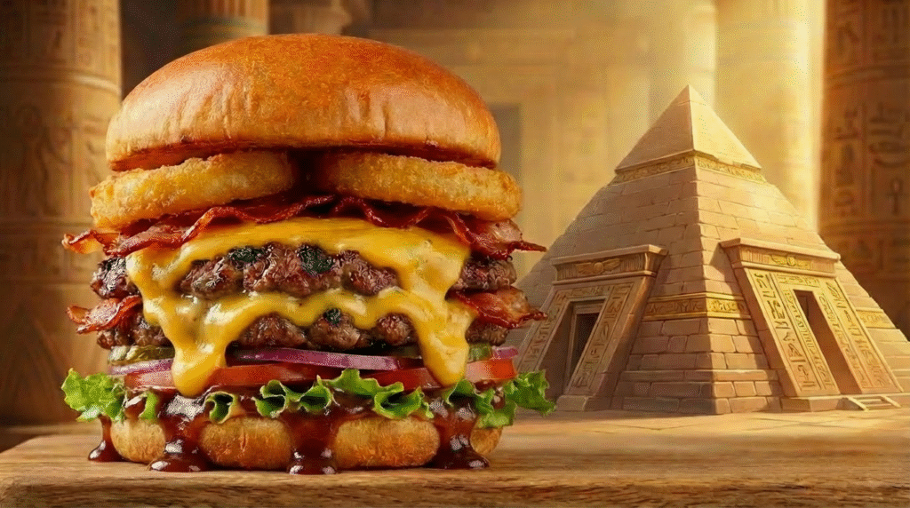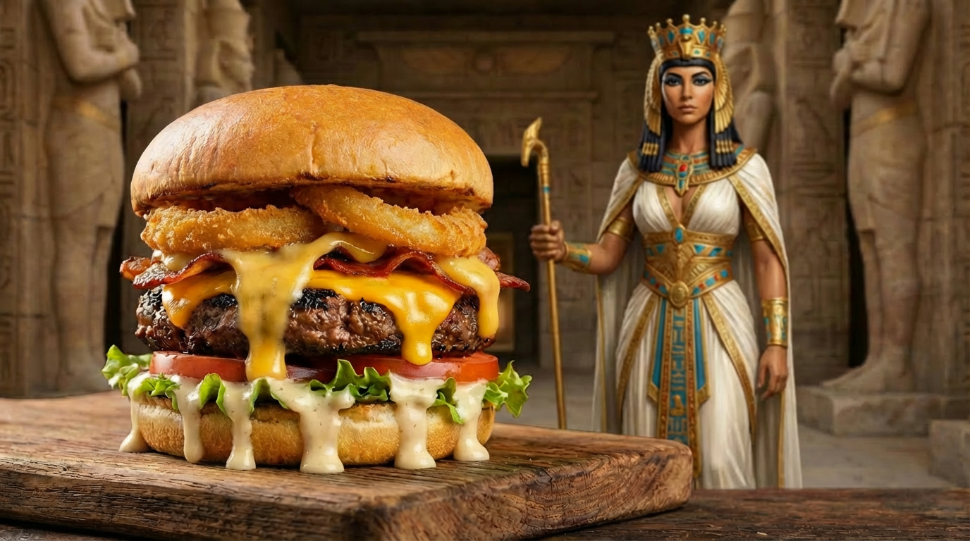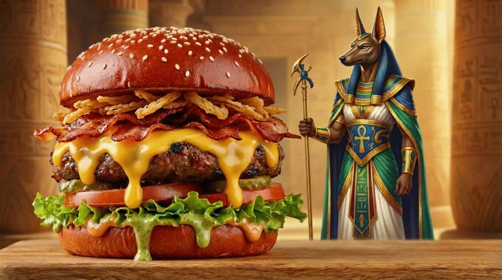 Inspirados pela grandiosidade da mitologia egípcia, criamos hambúrgueres artesanais temáticos, onde cada receita carrega personalidade, intensidade e sabores marcantes — verdadeiros tributos a deuses lendários como Anúbis, Hórus e Rá. Aqui, nada é comum: do nome dos lanches à apresentação, tudo foi pensado para surpreender.